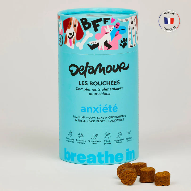 Delamour nerimo maisto papildai, sukurti kartu su veterinarijos mitybos ekspertu dr. Éric Charles, sudėtyje turi 18 veikliųjų medžiagų, tokių kaip L-triptofanas, Lactium® ir raminantys augalai, kurie padeda reguliuoti jūsų šuns nerimą. Skanėstai suteikia ramesnį, harmoningesnį ir atsipalaidavusį kasdienį gyvenimą dėl visapusiško trigubo poveikio: taiso praeities problemas, malšina dabartinį diskomfortą ir apsaugo nuo pasikartojimo ateityje.