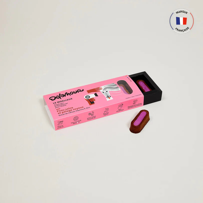 „Moelleux“ sveika oda ir šilkinis kailis padeda pagerinti jūsų šuns kailio kokybę ir blizgesį dėl vaistinių augalų, vitaminų ir mikroelementų mišinio. Tai yra daugiau nei tik užkandis: idealiai tinka ypatingoms progoms ar kasdieniams skanėstams.